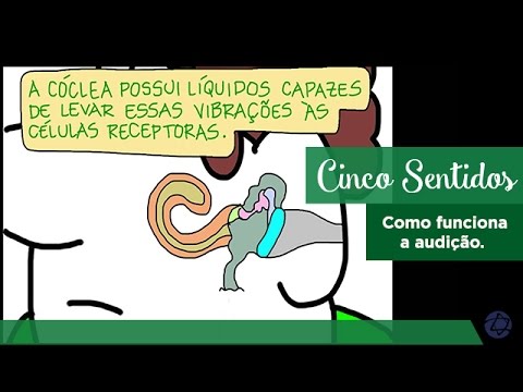 As ondas sonoras chegam até o aparelho auditivo, fazem o tímpano vibrar que, por sua vez, faz os três ossos da orelha (martelo, bigorna e estribo) vibrarem; as vibrações são passadas para a cóclea, onde viram impulsos nervosos que são transmitidos ao cérebro pelo nervo auditivo.